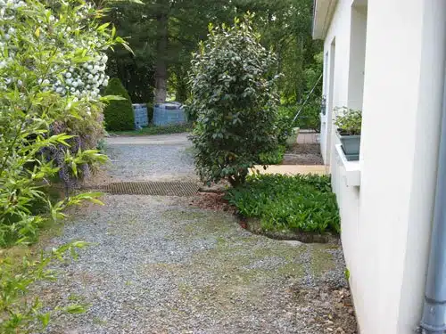 La pente complique la mise en œuvre et nécessite un drainage latéral pour éviter l’érosion. Le compactage renforcé garantit la stabilité du revêtement malgré l’inclinaison. Ce type de configuration est fréquent dans les maisons périurbaines avec un accès depuis la route en dénivelé, notamment pour une allée de garage.
